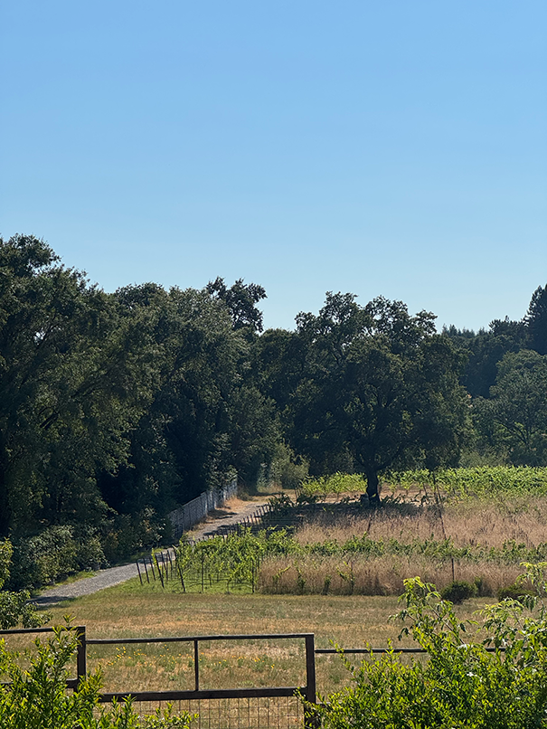 View of the ceremony space (under the tree) from the cocktail hour space.