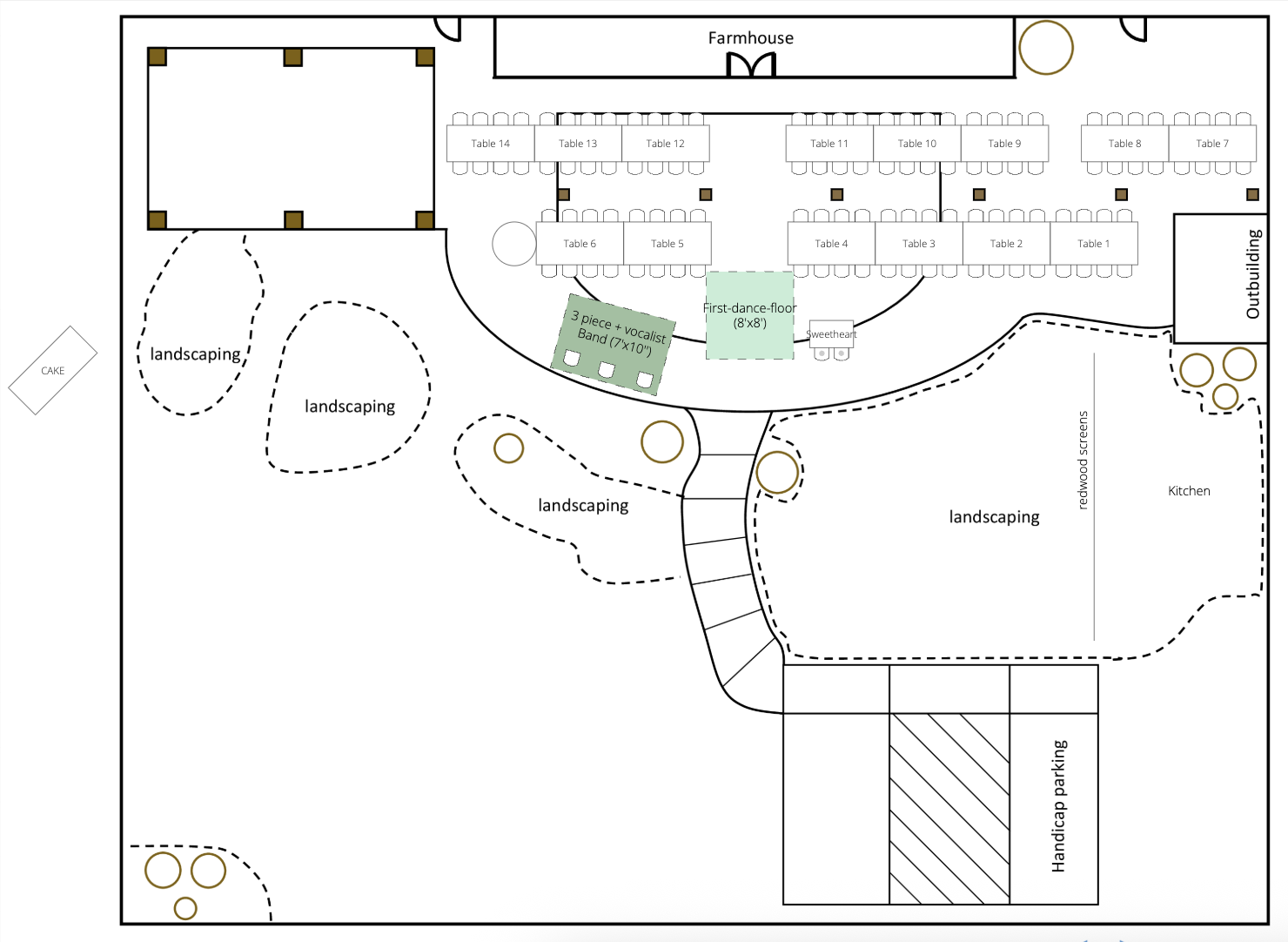 Here is the immediate view once you walk up the stairs from the parking lot. This is likely where Holly and I will make our grand entrance. To the left is the awning under which dinner will happen. To the right is “the Club” where dancing will happen.
